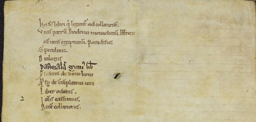 Another book list written by the hand of Symeon of Durham is likewise central to Benedictine life and likewise patristic — this is the list of books to be read at Collatio in DCL B.IV.24: